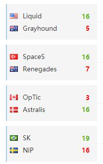 B组首轮比赛中,Liquid凭借EliGE和NAF的疯狂发挥(两人合力贡献47个击杀)轻松以16-3击败Grayhound;Space Soldiers虽然因签证问题缺少Cylax,但在inferno先做进攻方的他们凭借犀利的枪法在上半场就攻下11分,下半场拿下第一个长枪局后一鼓作气轻松获胜;面对全丹麦阵容的新Optic,正面男孩Magisk所在的Astralis还是更胜一筹,以16-3轻松击败素质男孩K0nfig,赢下了这场丹麦德比。SK和Nip的比赛是唯一一场拖入加时的比赛,上半场SK拿下手枪局后第二回合就被NiP翻盘,此后双方比分交替上升,下半场还是SK先以15-12拿到赛点,但小将REZ站了出来,两次突破将比赛拖入加时,然而加时赛中还是SK抓住了机会,fer的三杀最终终结了NiP,担任指挥的冷神依旧拿到了32-21/1.41的数据。