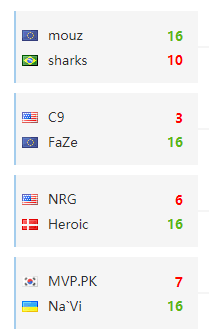 A组的比赛中,mouz在inferno上半场先做防守方时开局不利被对手拿到6-0开局,但老道的他们还是稳住节奏,在下半场稳扎稳打,以16-10拿下对手。而Heroic和Na‘Vi的对手都没有给他们带来太大压力,Heroic在上半场就取得12-3的大比分优势,下半场一鼓作气带走了NRG,Na’Vi面对他们的亚洲对手MVP.PK,上半场在丢掉手枪局的情况下长枪局里连拿9分,并在下半场再输一个手枪局的情况下第二回合钢枪翻盘,最终以16-7取胜。而在Cloud9与新科IEM冠军FaZe的比赛中,地图再次来到双方在IEM悉尼站中交手过的cache,C9在悉尼时在这张地图上惨败于FaZe,而来到家乡美国的他们也没能在FaZe手中翻出大浪花,NiKo27-9/2.23的数据给C9安排的明明白白,FaZe以16-3轻松晋级胜者组。