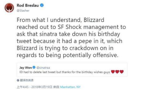 比如今年3月Slasher在推特上曝光,暴雪官方通过队伍管理层要求旧金山震动队选手sinatra删掉在社交媒体上发布的与Pepe相关内容,尽管那只是一条sinatra为自己庆祝生日的推特: