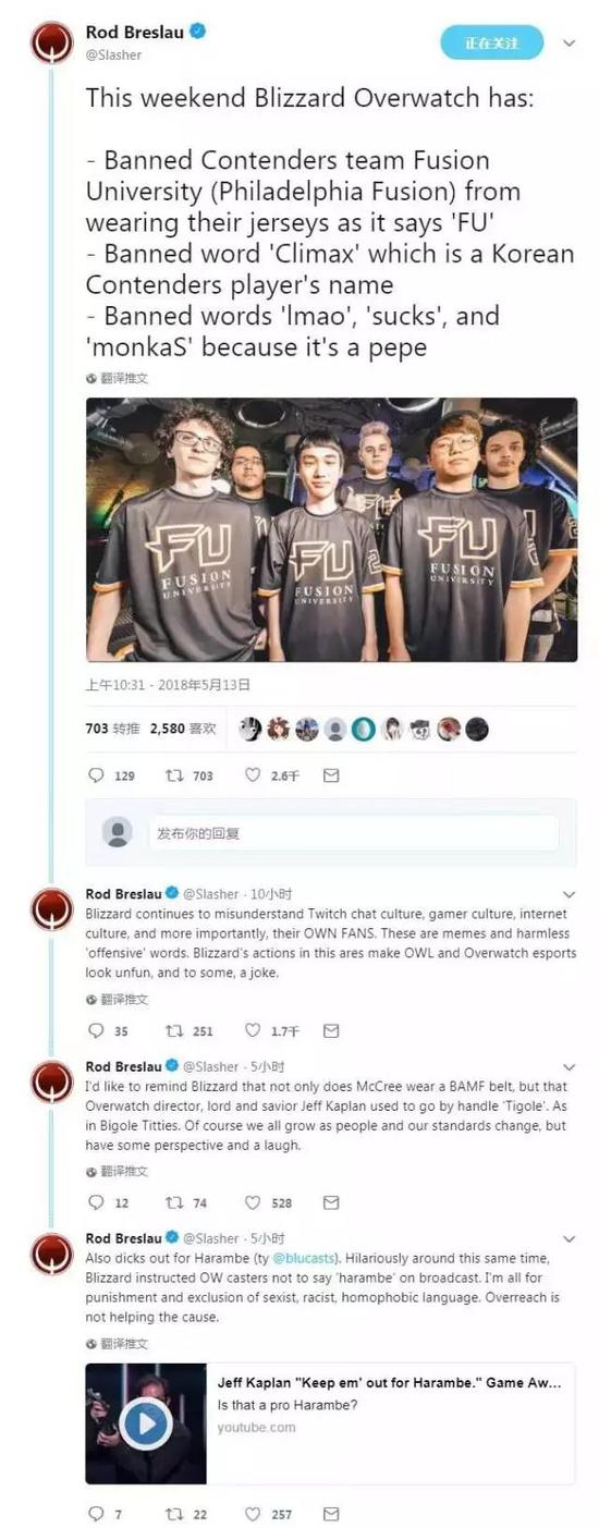 如果说是担忧这些网络文化会带来的后果,那么这些词汇或者表情包被“ban”倒也说得过去,但暴雪的此次举措,之所以会引来抱怨,不仅在于限制玩家对网络词汇的使用。在Slasher看来,暴雪的处理方式存在着双重标准的嫌疑。 比如2016 TGA 颁奖典礼上,Jeff发表感言时曾提到了Harambe这个词,而如今暴雪却规定不许玩家在直播中提到这个词(美国俄亥俄州辛辛那提动物园因掉进隔离区的小孩被枪杀的猩猩Harambe,《守望先锋》中的温斯顿有时候也会被玩家称为Harambe。),这让他不能理解。