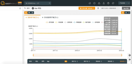 市场渗透率决定着未来直播平台在游戏直播产业能否完全发力,根据虎牙公布的2018年Q1财报来看,虎牙的月活跃用户达到9290万,同比上涨18%,对比起2亿的注册用户相当于4个用户就有1个月活。这个数据遥遥领先与其他平台,这一点在QuestMobile也得到证实。