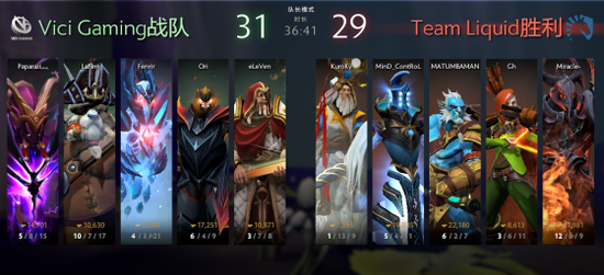 巨大优势Liquid无脑冲高,VG依靠着露娜买活再为自己续命。Liquid随后选择稳中求胜,打盾上高双方拼买活还是被Liquid成功攻破中路高地。最后Liquid稍作发育后再从中路突破,老十一小娜迦睡接陨星锤失误,Liquid一拥而上,VG兵败如山倒遭Liquid无情碾压。