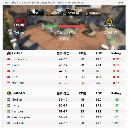 SLi S5总决赛第四比赛日,TYLOO迎战瑞典战队GODSENT,这场比赛对于双方来说都没有退路,TYLOO能否调整状态拿下比赛,地图BP如下: