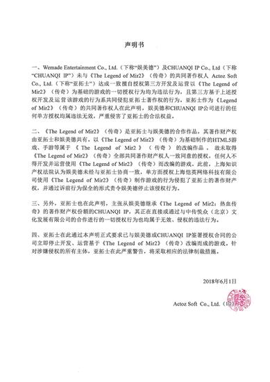四、亚拓士在此通过本声明正式要求已与娱美德或CHUANQI IP签署授权合同的公司立即停止开发、运营基于《The Legend of Mir2》(传奇)改编而成的游戏。并且,针对上述涉嫌侵权的主体,亚拓士在此严重警告将采取相应的法律措施。
