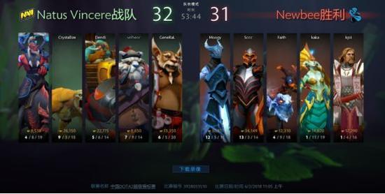 Newbee与NaVi的首轮交战,前期发条技师为Newbee全队打开局面,在避过NaVi狼人的强势期后,成型露娜终结比赛。第二局NaVi攻势如潮,Newbee人头大幅落后,但经济始终保持均势。随着双核成型,龙骑士在团战中输出极高,装备阿哈利姆神杖的娜迦海妖也发挥巨大作用,Newbee击败NaVi,进入胜者组决赛。