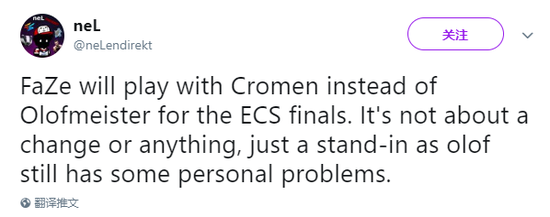 根据neL的消息,并不是FaZe想要换人,只是olofmeister还有一些私人事务需要处理,因此FaZe决定启用cromen。