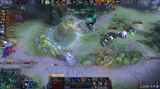 25分钟TNC强打肉山,VGJ.S到场小娜迦大招先手控场,可连续的配合失误,这个小娜迦的睡帮助TNC躲掉无数技能。兽王第二时间切入吼到大圣,VGJ.S瞬间死亡。TNC顺势上高一波按死将比分扳平。