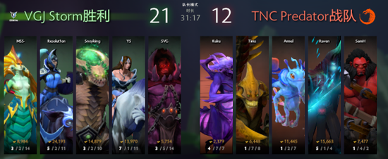 决胜局VGJ.S点出幻影长矛手(猴子)加拉席克双核,TNC为了缓解对线压力只能最后一手点出小狗。这局VGJ.S中单拉席克完美化身ATM,各种被单杀,甚至队友看着莱恩吃到隐身符还能被TNC轻松GANK。依靠了拉席克频繁送上的人头大礼,白虎打出无解肥中肥,13分钟便完成了超神任务。之后比赛VGJ.S拼接出色的阵地能力抗住局面,但真正到了大后期只有resolut1ion一人能够站出来。拉席克拿盾拿奶如同白送,团战见光死。最终肉山出白虎吃到双倍一波打出8000+伤害送走VGJ.S。