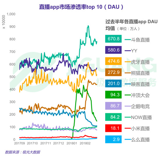 在极光大数据最新公布的直播app市场渗透率报告中显示,斗鱼在最近半年中独占鳌头,远超其他平台。数据为王,PC、移动双霸主地位已足以证明斗鱼在国内的影响力之大。