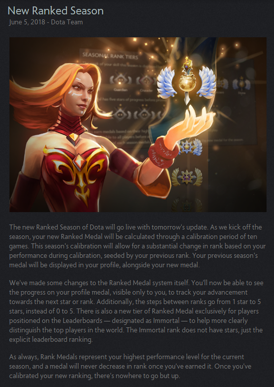 今天早些时候V社通过DOTA2官方博客公布了Dota新的天梯赛季相关内容,新赛季中玩家将会重新定位,并且获得全新的奖章。