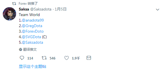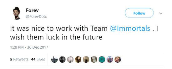 韩国选手Forev在去年年底发推特,称从Immortals离队并对战队表示感谢。此后,也有传出Forev与Ana、saksa等人组新队的消息,但随着SVG进入VGJ.S,Ana加盟Echo而后重回OG,saksa与Misery组成五狗战队备战TI8,Forev仿佛又逐渐失去了音讯。