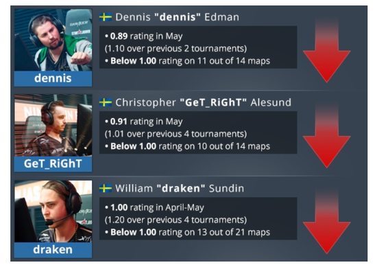ESL S7与SLi S5两场比赛让NiP看到了三名队员状态的下滑。dennis是下滑最严重的,两场比赛的rating只有0.89,而GeT_RiGhT也只比他好一点,rating0.91。自从四月起,我们一直关注着draken,现如今他也加入了“熊市”。