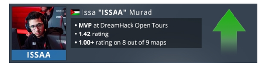 尽管在SLi S5中ISSAA表现平平,但在DreamHack 图尔站其亮眼的操作已经证明了他的实力。尽管一开始输给了EnVyUs,但在随后的比赛中他带领队伍一路过关斩将,最后荣获MVP。