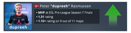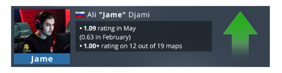Jame在一月ELEAGUE Major Main Qualifier赛后进过“牛市”一次,接着在IEM卡托维兹处于低谷时又下跌入了“熊市”。在近期的SLi S5中,狙击手Jame回归接连击退Gambit,GODSENT和Liquid,平均场次rating达1.11。