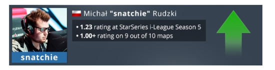 snatchie可以算是五月的一匹黑马了。在SLi S5小组赛中。他为队伍打败VP,NiP和mouz作出巨大的贡献,但在随后的八进四淘汰赛对抗North时遗憾落败,这使得他失去EVP提名的资格,并且AGO也没能走到最后,但他仍是潜力巨大的明星选手。