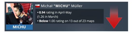MICHU曾经参加完V4未来体育节后上过“牛市”,然而在最近几场比赛中队伍名次都不是很好,个人rating也从3月的1.26下跌到0.94。