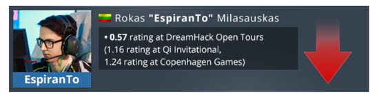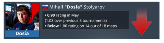 在5月中,他总体的表现一直在走下坡路,在ESL S7和SLi S5只有5张地图的rating超过1.00。