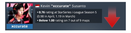 xcc在三月已经跌入“熊市”一回了,当时他的rating仅仅高于一些小比赛和IEM悉尼。两月来他似乎状态有点回升,但在SLi S5中发挥依旧不尽人如意,与同队AE一起被列入“发挥不佳”选手名单中。