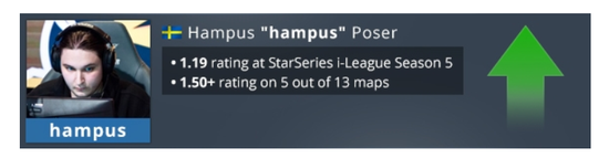 在加入GODSENT后,hampus迎来了职业生涯中首个大型比赛--SLi S5,并且在其中个人表现也十分抢眼。在基辅他虽然状态时好时差,但还是数次达到了职业巅峰状态。