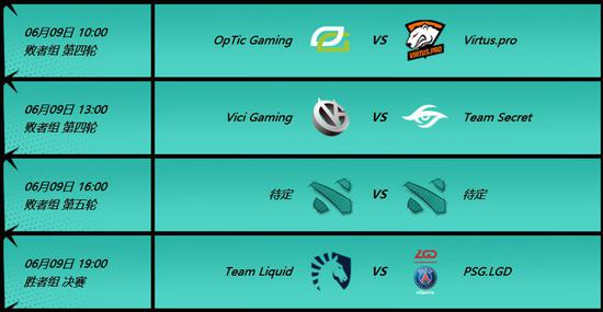 两天的线下赛,来自全世界的六支豪门战队将展开对决。6月9日,OpTic将挑战目前职业巡回赛积分榜首的VP战队,这一对决直接决定了OpTic能否获得国际邀请赛的直邀资格,想必十分吸引眼球。VG将面对Secret,VG能否更进一步,冲击更高的荣誉?这两场对决的胜者将决出进入败者组决赛的名额,而当天的最后一场对决,将在Liquid和PSG.LGD之间展开,谁能率先进军总决赛?