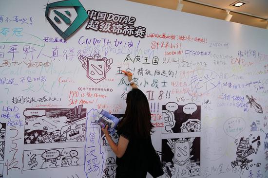 进入场馆后,涂鸦墙迎来玩家的自由创作。涂鸦、签名、留言,玩家用自己手中笔,表达着对DOTA2的支持与热爱。门票上的应援券也由玩家投入战队应援箱,每场比赛的获胜战队将抽出幸运观众,获得战队送出的惊喜好礼。