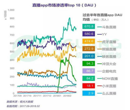 第一个要素为平台实力本身。斗鱼在国内直播行业中牢牢占据着领头羊的角色。首先是其核心支柱游戏直播领域,斗鱼作为在游戏直播平台中首屈一指的顶级平台,有其独特的推广策略打法:通过《英雄联盟》《绝地求生》等顶级赛事的直播,斗鱼迅速吸引了大批用户的入驻,在此基础上,斗鱼又凭借其强大的平台运营能力,打造出一位又一位流量主播,形成了紧抓用户与扶持主播的良性循环,而斗鱼直播以670.8的数据登上极光大数据2017年9月到2018年2月的直播app市场渗透率TOP1即是对平台实力的最好证明。
