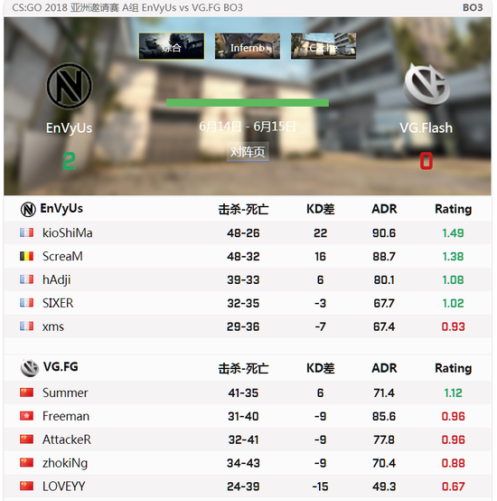 这场是A组败者组第一轮VG.FG对抗EnVyUs,虽然0:2遗憾落败,但是在枪法方面也是得到了爆头哥的肯定。另外还有一支中国战队TYLOO将于明天下午1点开始它的第一场比赛,让我们敬请期待。下面是具体的对阵信息: