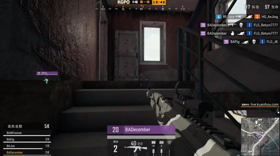 M城左下角狙击楼处BA选择强攻楼内FLG。BA战队漂亮的两枚手雷直接炸倒FLG两员,BA立马强势跟进将两人补掉。