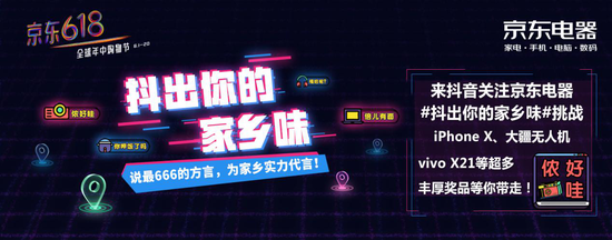 与此同时,只要你在6月1日起至6月18日,京东618全球年中购物节期间,参加京东电器在抖音发起的#抖出你的家乡味#挑战赛,使用“抖出家乡味”(侬好哇)贴纸创作神转折抖音视频,用家乡话说“买电器上京东”即有机会赢iPhone X,大疆无人机,vivo X21等丰厚奖品!快来比比看谁才是正宗的本地人?活动细则见下图: