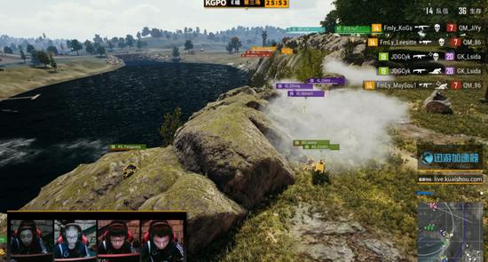 湖边石崖处,IG与KG短兵交接,IG利用烟雾弹封住身后敌人视野正面解决掉了KG全队。