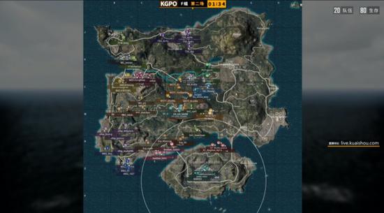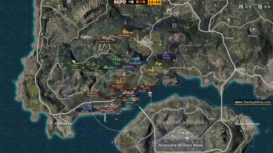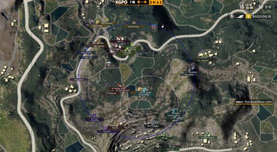 后面的安全区以机场前方山坡进行刷新,处于蓝圈的左下角贴边处,右侧队伍人数较多,战斗情况较为严重。
