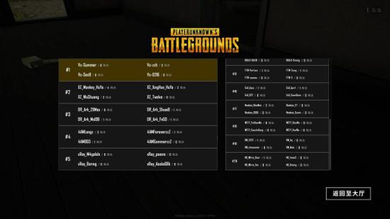 决赛圈内以矿山下方的三座房区进行刷新,平原区域较多,许多队伍没有掩体进行对枪,减员速度极快。混战结束后DR防守圈中心房区,4AM夏天狙掉其中一人后其余4AM成员果断强攻,但是DR应对迅速从房区内拉出将4AM全员淘汰。另外两个房子内XZ与VC互相牵制。场面上三队各据一房三国鼎立。XZ光线圈刷新前主动出手,强攻DR所在房区。另一侧VC捉住机会果断出手,将DR与XZ外侧成员全部淘汰。最后场面为三队2V2V2对决。光线圈收缩后VC二人枪法取胜,成功吃鸡。
