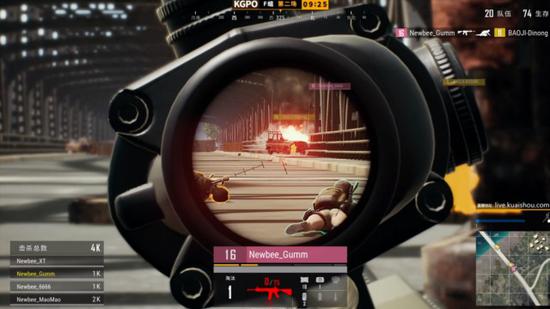 NB在左侧大桥堵截敌人,baoji战队先后四辆车路过被NB扫射击倒了三人,仅剩一员逃离。