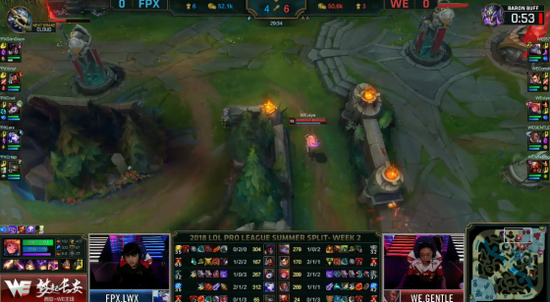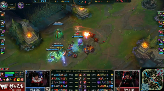 FPX选出了一个以NOC为核心的阵容,在前期找到了自己的一些节奏,在推塔方面稍微领先WE,但WE却稳稳的控到了三条小龙,这填补了WE经济上的一些损失。