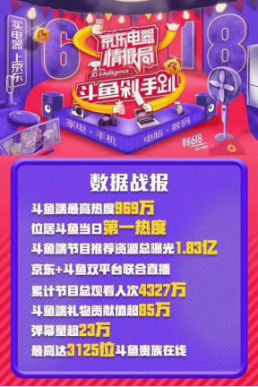 事实证明,所带来的效果必然会是“1+1>2”,6·18当日,斗鱼端最高热度969万,位居斗鱼当日第一热度,节目推荐资源总曝光达到1.83亿;京东+斗鱼联合的联合直播累计节目总观看人次高达4327万。实际上,“斗鱼剁手趴”达到这样的累累战果,从其近来迅猛的发展速度以及健康的发展模式之中就可见一斑了。