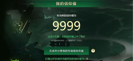 信仰之光记录各位勇士曾有过的辉煌,更奖励每一位仍在癫狂之月下奋战的勇士的勇武。在活动期间完成相关任务,仍可提升你的信仰值。充值TI8勇士令状,开启典藏宝瓶可大幅提升信仰值;完成规定的比赛任务,在神秘商店购买限定周边,以及分享信仰页后获得好友充能等,也都可提升你的信仰值,从而获得更好的奖励。是时候分享信仰页面,呼叫一起开黑的小伙伴为自己提升信仰值了。