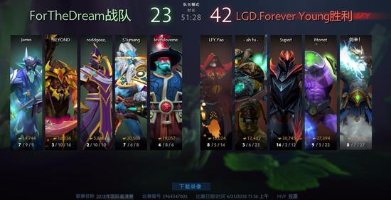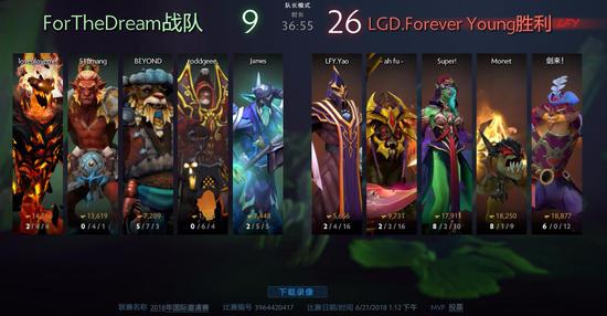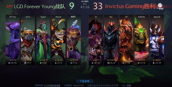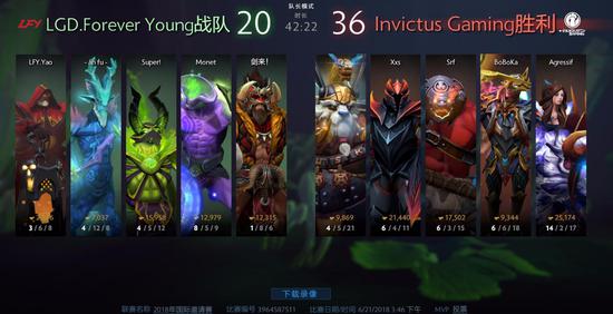 第二局iG依然选出了白虎龙骑作为双核,LFY以一套团战阵容来应对。看上去线上强势的LFY并没有打出应有的优势,iG三核发育良好。就在双方僵持不下时,龙骑斧王多次打出完美先手将LFY击溃,掌控比赛后iG没有再给LFY翻身的继续,一路压制对手拿下门票。