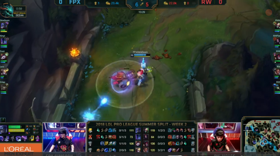 比赛前期,双方打的都很凶,FPX的梦魇连续在上下两路击杀了三个头。拿到优势后FPX配合上单慎的大招直接越塔击杀RW下路组合拿下一血塔。眼看下路要崩盘,RW一波三TP反打直接击杀FPX四人,把劣势全部追了回来。
