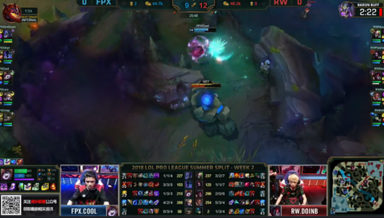 中期,双方不断爆发团战,RW抓住机会,击杀了FPX的双C随后RW直接拿下大龙,经济领先到3000。