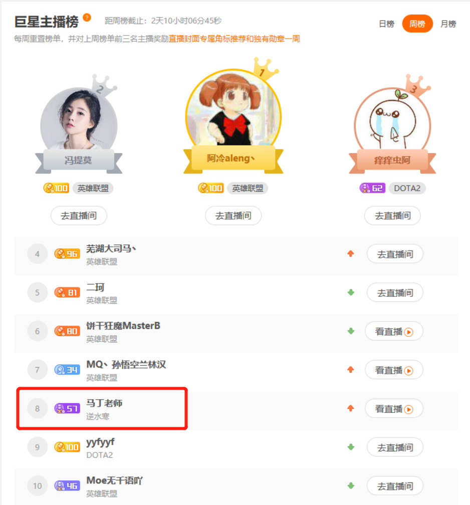 目前斗鱼《逆水寒》专区已有多名主播脱颖而出,例如主播马丁老师,在《逆水寒》专区开播后迅速攀升至巨星主播榜前10,力压YYF位列第8。马丁老师是一名幽默风趣的“人民币玩家”,喜欢与观众互动且性格多变,最爱骑马聊天,人送外号“汴京马王”。