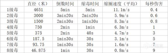 倒数时间与缩毒时间均为基础数值,圈的直径由数方格测量法算出,误差在5米内,将圈设为同心圆即可算出平均缩圈速度,电网的伤害并没有测试,直接继承之前的数据。我们再来看8X8的地图蓝圈数据~