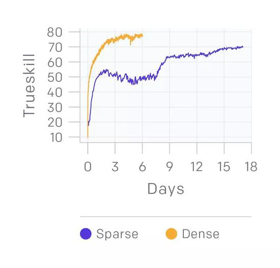 二元奖励可以给予良好的表现。我们的 1v1 模型具有形状奖励,包括上次命中奖励,杀戮等。我们进行了一个实验,只奖励代理的获胜或失败,并且让它在中间训练了一个数量级较慢并且稍微平稳的阶段,与我们平常看到的平滑学习曲线形成对比。该实验在 4500 个核心和 16 个 k80 GPU 上进行训练,训练至半专业级(70 TrueSkill,而非我们最好的 1v1 机器人的 90 TrueSkill)。