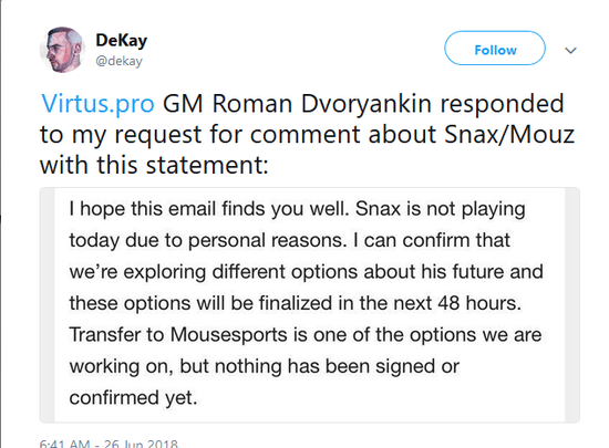 今晨,年中的换员嘉年华又迎来了一个小高潮,爆料网站DBLTAP的老铁收到了来自VP的GM发的信息。表示Snax因“个人原因”将缺席MDL,然而似乎嗅到了不寻常气息的经理表示Snax极有可能离队,而最有可能的新去向就是Mouz,但一切都还尚未确认,经理表示这个结果最快在48小时之内就能落定..