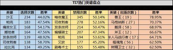 TI7沙王凭借其稳定的先手控制和团战的爆发能力成为职业战队的宠儿,无论是Newbee.kaka还是Liquid.GH都是该英雄的忠实用户。帕克被开发出三号位打法后再度流行,无论是团战还是带线都是一等一的好手。夜魔在TI7之前的版本改动中获得了黑夜时间高空飞行的neglect,也正因如此他才能荣登TI7禁用榜榜首,自此之后V社对夜魔是一削再削,可见这名英雄的强大能力。