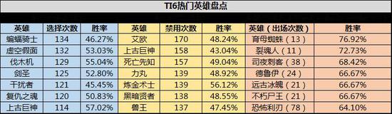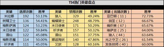 TI4推进战术大行其道,所以狼人被ban率高居榜首不足为奇,诸如Sylar等核心位选手都是狼人的忠实爱好者。酒仙和末日使者也是TI4上备受关注的英雄,Newbee.Mu在仅剩一滴血时开出大招的操作成为流传至今的经典时刻。