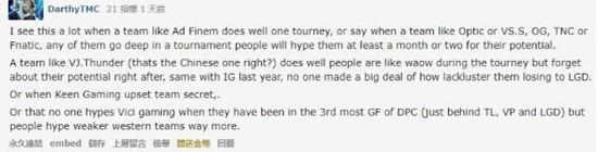 大意为:我发现像Ad Finem这种(二三流)战队在一个比赛里,或者OpTic、VS.S(应该是VGJ.S)、OG、TNC或者Fnatic这种队伍在一个比赛里打的很好,大家就要吹他们(的潜力)至少一两个月。像VGJ.T这种队伍在一个比赛里打得好,大家很快就会忘记他们。就像去年的IG,没人会在意他们,觉得他们输给LGD没啥说的。或者是(今年GESC)KG战胜秘密。也没有人吹VG战队,他们的DPC分数只是低于液体、VP、LGD(秘密和Mineski)这几个队伍。大家总会觉得西方那些弱队更有看点。