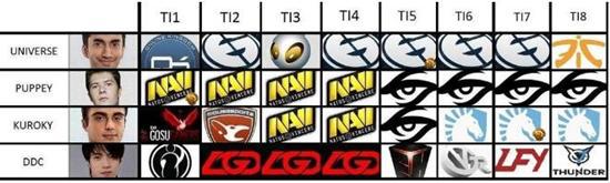 在前几天一个“老兵名单”的帖子中,名为Enjoied的网友列举了目前全勤的老兵名单,包括了美国的宇宙哥Universe,爱沙尼亚拳击手Puppey、德国张志成kky和澳门飞龙ddc。这几位都是久经沙场的老将了,连续8届参加TI正赛也是非常了不起的成就。不过名单里只有ddc没有拿到TI冠军,宇宙哥随EG在TI5夺冠,Puppey则是TI1和老司机的Na‘Vi夺冠,kky在去年TI7上和液体一起圆梦。