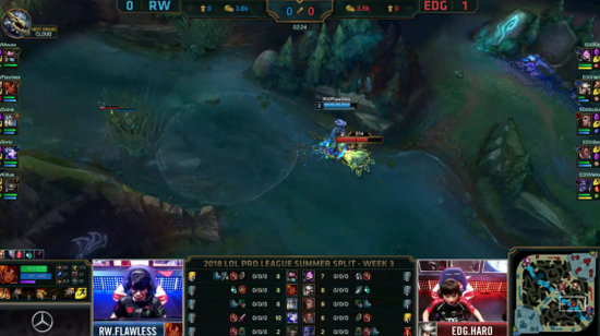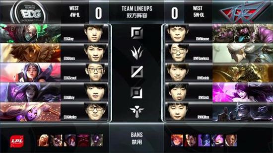 EDG选出一套需要发育的后期传统阵容,而RW基础一套极其讲究中野节奏的阵容,并且下路是莫甘娜配合慎的体系,比赛开始双方打野均是红buff开。