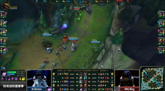 比赛前期,RNG选择让布隆卡兵线,让Uzi拿到线上和野区的双资源。尽管效果还是不错的,但是IG在打野青钢影的帮助下下路击杀了一次牛头,下路取得优势。随后拿到优势的IG下路直接线上对线击杀吸血鬼。