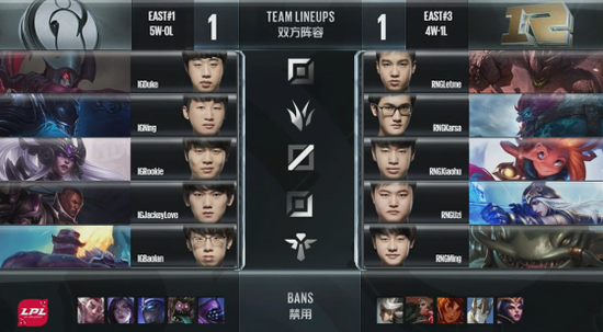 IG:剑魔、青钢影、加里奥、乌鸦、莫甘娜RNG:蒙多、布隆、霞、吸血鬼、牛头